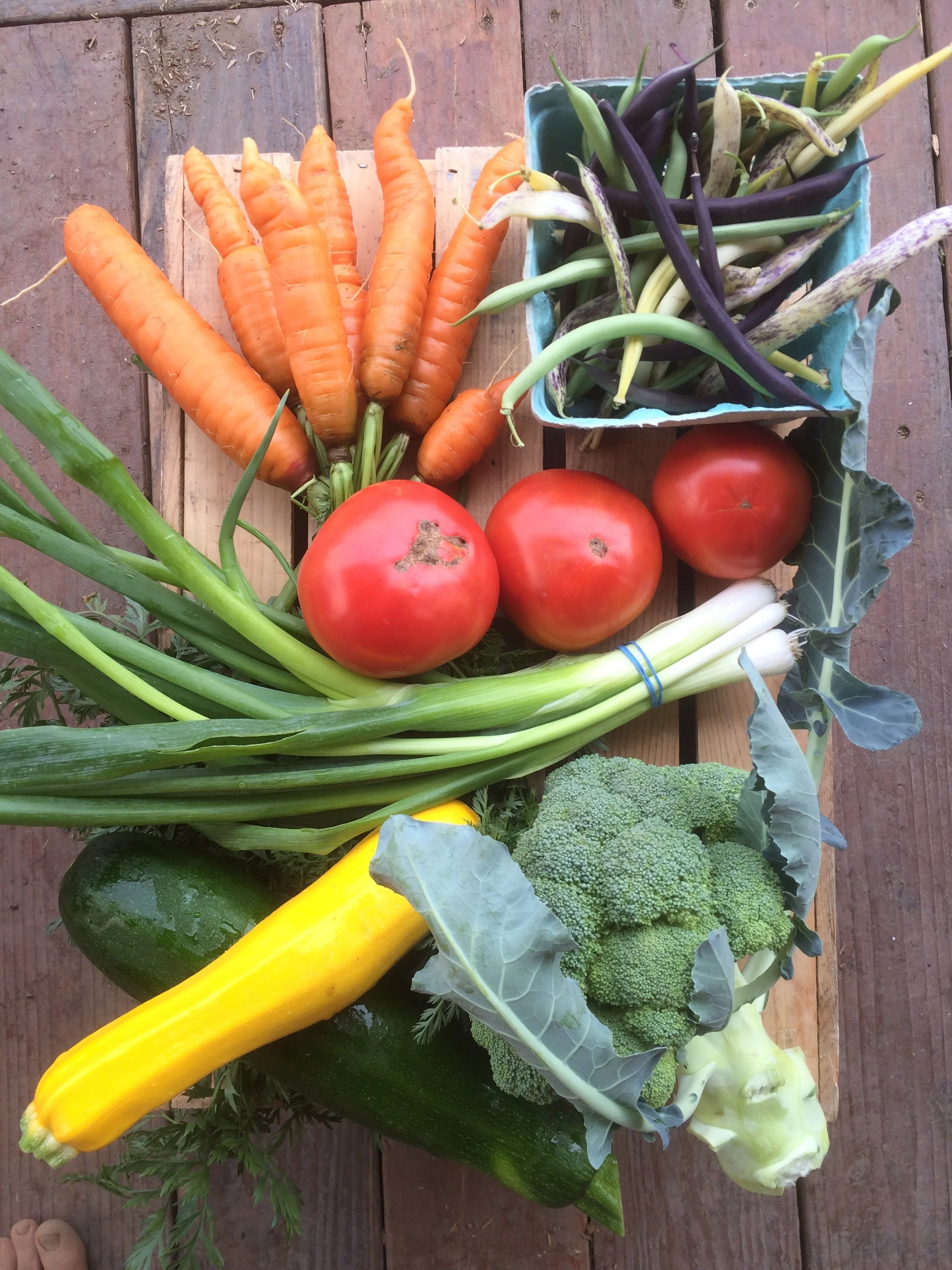 We sell seasonal products, mainly fresh produce from our farm. We also bring in veggies and other items from local producers. These include pasture raised eggs and meats, seasonal organic berries, flour, honey, flowers, and more. Any food that we bring in from other sources is produced with organic/sustainable practices. Even more, we do our best to know personally and have relationships with the growers, and trust their practices.